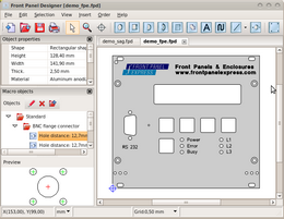 Lorsque vous ouvrez le programme, la fenêtre principale est ouverte avec la zone de travail où vous pouvez créer et modifier les fichiers des faces avant. À côté des barres de menus et d'outils, vous voyez les propriétés des objets sélectionnés ainsi que le catalogue des objets de macro disponibles. |