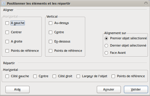 Remarque : La partie supérieure du dialogue qui permet d'aligner les objets, a été ici coupée. |